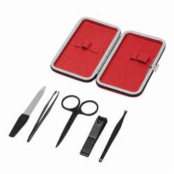 Inhalt: Eine Nagelfeile, eine Pinzette, ein Nagelhautschneider, ein Nagelclipper und eine Schere. Alles in einem eleganten rechteckigen Etui mit seitlichem Druckknopf.