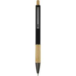 Der Kugelschreiber hat einen Druckmechanismus und einen unteren Körper aus Bambus. Die Tinte ist blau und sorgt für ein reibungsloses Schreibgefühl.