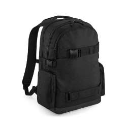 Zusätzlich gibt es spezielle Riemen zur Befestigung eines Skateboards und eine praktische Transportgriff.