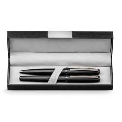 Set aus Metallkugelschreiber und -roller mit Clip und Drehmechanismus.
