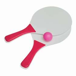 Es beinhaltet zwei Holzschläger mit bunten Griffen und einen Softball, alles verpackt in einem praktischen Netz.