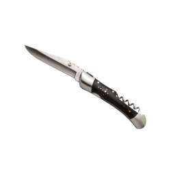 Faltmesser mit Klinge aus rostfreiem Edelstahl 420. Der Griff besteht aus schwarzem Stamina. Ausgestattet mit einem eleganten Guilloché-Federmechanismus. Zwei geschmiedete Edelstahl-Mitanstöße sorgen für Stabilität. Inklusive einem Korkenzieher mit 4 Spiralen aus Edelstahl – besser als die üblichen 3 Spiralen.