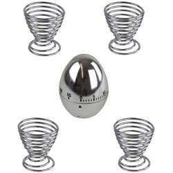 4 dekorative Eierbecher (Durchmesser 5 cm, Höhe 5,5 cm) und ein Küchenuhr-Timer (bis zu 60 Minuten).