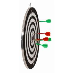 Doppelseitige Dartscheibe mit 6 Dartpfeilen.